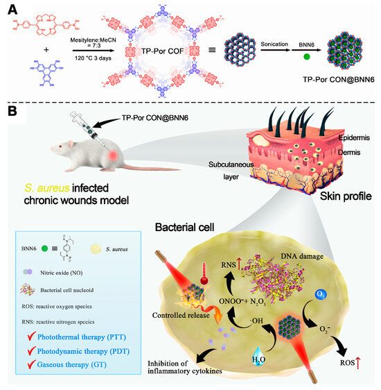 (A) Preparation procedures of TP-Por CON@BNN6 (TP-Por CON: porphyrin-based COF, BMM6: NO donor); (B) The combined application of TP-Por CON@BNN6 in the field of chronic wound infections (PDT + PTT + NO induced gas therapy). Reproduced with permission from [43]. Copyright (2021), American Chemical Society.