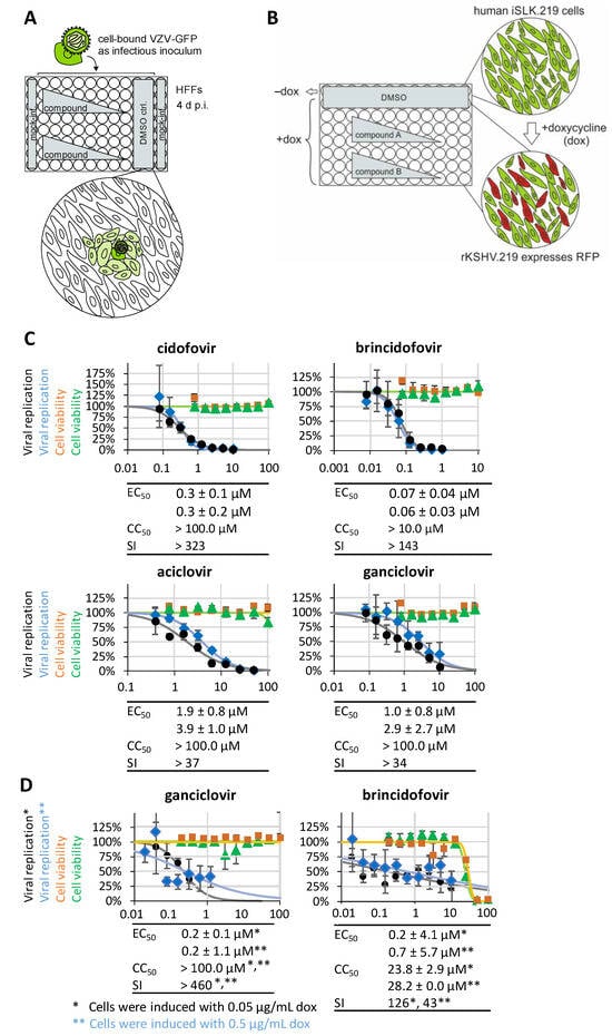 Establishment of new antiviral reporter assays for VZV and KSHV, including their calibration with reference drugs. The virus recombinants VZV Oka-GFP and rKSHV.219-GFP/RFP were used for the infection of HFFs (VZV) or were continuously passaged in iSLK.219 carrier cells (KSHV), respectively, and cell viability was determined by NRA performed with uninfected HFFs or uninduced iSLK.219 cells, respectively. (A,B) Schematic depiction of the assay systems performed in a 96 well plate format. Both assays can be performed in the 96 well format, which allows working with quite small quantities of material, or alternatively in the 12 well format, which may increase signal intensities. For the VZV-GFP system, virus stock VZV Oka-GFP was applied as a cell-bound infectious inoculum. After a 90 min period of inoculum adsorption to the cell surfaces, antiviral compounds were added to the culture media at serial dilutions (DMSO served as a solvent control for drug treatment of infected cells, while mock-infected cells served as a negative control). For the KSHV-GFP/RFP system, iSLK.219 cell lytic replication of KSHV (RFP reporter signal) was induced by the addition of 0.05 or 0.5 µg/mL doxycycline (dox) to the culture media. Cultivated dox-induced iSLK.219 cells were treated with antiviral compounds added at serial dilutions (DMSO served as a positive infection solvent control, while dox-untreated mock cells served as a negative control). HFFs or iSLK.219 cells were harvested at 4 d p.i. or 1 d after treatment, respectively, fixed by a 10 min incubation with 10% formalin, washed with PBS, and used for quantitation of the GFP or RFP reporter signal by PicoMD counting (ImageXpress® Pico device, Molecular Devices LLC, San Jose, CA, USA), with data evaluation using CellReporterXpress® software (version 2.9.3.1183, Molecular Devices LLC) as described earlier in [63]. (C) The antiviral activity of the reference drugs was determined with the VZV-GFP system in the 96 well format. EC50 values refer to measurements in quadruplicate, and the mean values ± SD of two experimental replicates are given. (D) The antiviral activity of the reference drugs was determined with the KSHV-GFP/RFP system in the 96 well format. EC50 values refer to measurements in triplicate, and the mean values ± SD are given for each of the two depicted experimental replicates.