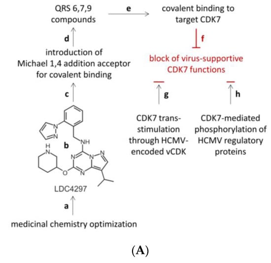 Building on these findings, we generated pharmaceutically active pyrazolotriazine derivatives as selective inhibitors of CDK7, termed QRS6, QRS7, and QRS9 (Figure 2A). These compounds share with LDC4297 the properties of ATP-competitive inhibition, hinge-binding activity, and structural similarities. However, these novel compounds also show significant structural differences toward LDC4297, such as the distinct covalent binding unit, sugar pocket binder characteristics, and a linker moiety placed between the covalent binding units and hinge regions (structural details confidential at the request of the compound provider; Yu et al., manuscript in preparation). The covalent binding properties of QRS6, QRS7, and QRS9 are mediated through an acceptor of the Michael 1,4 addition reaction (Figure 2A, panels a–d), which typically links the warhead to a cysteine residue of the target protein [68,69,70]. In particular, a linker moiety plays an additionally important role in the high selectivity of QRS6, QRS7, and QRS9 toward CDK7 (Figure 2A, panel e). The goal of these chemical optimizations was the generation of a selective covalent binder that was able to block virus-supportive CDK7 functions (Figure 2A, panels f–h), such as CDK7 trans-stimulation through the HCMV-encoded vCDK/pUL97 [46,66] or the CDK7-mediated phosphorylation of HCMV regulatory proteins [46]. As the drug targeting principle used here, the Michael acceptor mediated the covalent binding of a warhead compound, while the compound scaffold provided main target specificity, which can be individually supported by the coupling of a linker moiety, as designed according to the known target structure.