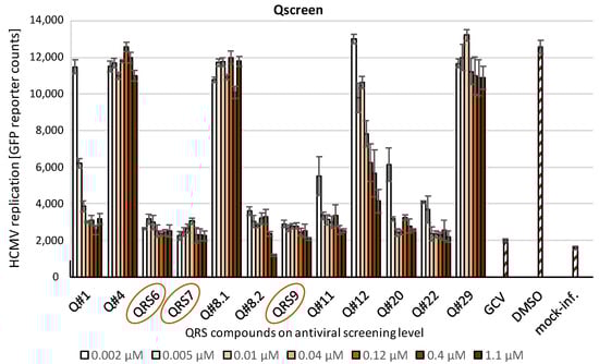 In order to address the question about the antiviral potency of novel Qurient compounds (Q#1–Q#29), in particular the in vitro characterized QRS6, QRS7, and QRS9, a round of antiviral screening was performed (termed Qscreen; Figure 3). To this end, an approved experimental reporter system was utilized, as based on the reporter-expressing HCMV AD169-GFP used for the infection of primary human fibroblasts (HFFs), which is applicable in both a 12 well or 96 well format [55,67]. As an important result, several of these covalently CDK7-binding small molecules showed rather pronounced anti-HCMV activity, among these being QRS6, QRS7, and QRS9 (comprising a complete block of viral replication and a reporter signal even at subnanomolar concentrations ≤0.002 µM). Other compounds were either negative or showed intermediate inhibitory phenotypes, which may depend on differences in their pharmacological properties, like cell permeability, intracellular stability, or unwarranted adverse binding effects. None of the screening compounds produced a notable level of cytotoxicity, as monitored by microscopic routine controls and a Neutral Red uptake assay (see the data below). In essence, the three compounds QRS6, QRS7, and QRS9 were identified as experimental hits comprising strong anti-HCMV activity and were thus nominated for further characterization.