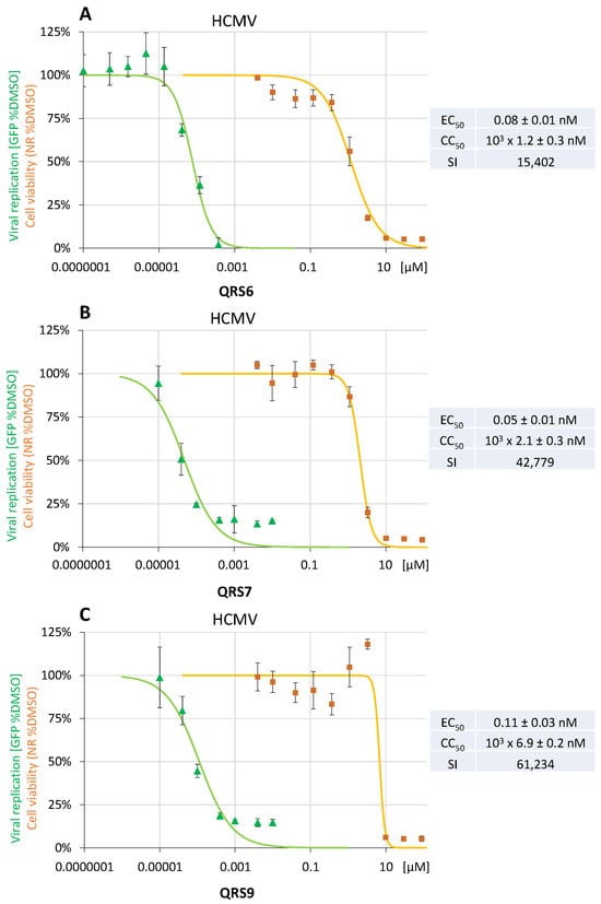 In a second step, the three hit compounds QRS6, QRS7, and QRS9 were specifically assessed for their anti-HCMV activity in quantitative terms. To this end, antiviral activity was assessed using the HCMV GFP-based replication assay in a 12 well setting using HFFs (Figure 4). The EC50 values were determined to be 0.08 ± 0.01 nM (panel A), 0.05 ± 0.01 nM (panel B), and 0.11 ± 0.03 nM (panel C) for QRS6, QRS7, and QRS9, respectively, while the cytotoxicity profiles were measured by a standard protocol of the Neutral Red uptake assay using mock-infected HFFs and resulted in mean CC50 values of 103 × 1.2 ± 0.3 nM, 103 × 2.1 ± 0.3 nM, and 103 × 6.92 ± 0.2 nM, respectively, thus indicating selectivity indices of >15,000 (SI quotients CC50/EC50; Figure 4). This finding strengthened the concept of utilizing covalent CDK7 binders for a further investigation of their antiviral properties.