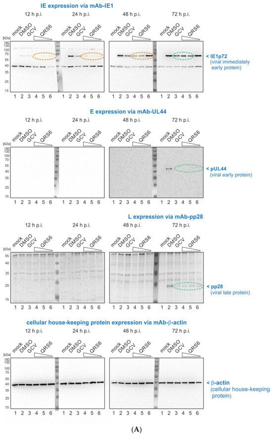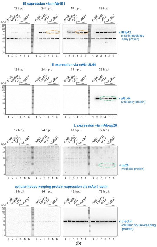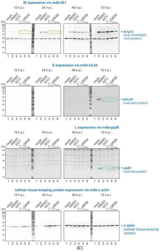 Mode-of-action (MoA) analysis of QRS hits against HCMV. Western blot (Wb) detection of viral IE, E, and L proteins. HFFs were cultivated in 12 well plates and used for infection with HCMV AD169-GFP (approximate MOI of 0.1). At the time points indicated, cells were harvested, used to prepare total lysates, and assayed by standard SDS-PAGE and Wb procedures. For the Wb immunostainings, antibodies against viral proteins of the different stages—immediate early (IE), early (E), and late (L)—of HCMV lytic replication were used (i.e., IE (mAb-IE1/EI1p72), E (mAb-UL44/pUL44), and L (mAb-pp28/pp28)), and mAb-β-actin was used as a cellular housekeeping and loading control protein. (A) QRS6. (B) QRS7. (C) QRS9. Note that those inhibitory effects showing clear differences (orange) in the antiviral MoA compared with the E-specific reference inhibitor ganciclovir (GCV), and those effects showing less pronounced or no difference (green) to GCV were marked by colored ovals. (Note, that primary Wb data are made available upon request).