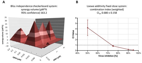 Synergistic anti-HCMV activity demonstrated for the combination treatment QRS6 + MBV. (A) Results of the Bliss independence checkerboard assay represented as a synergy plot at 95% confidence interval. Inhibition of HCMV replication by the single compounds at the indicated concentrations was determined, and a theoretical additive inhibition was calculated for each combination of concentrations. Depicted in the planar diagram is the deviation of observed inhibitory effects from this calculated additive value in percentage points, as calculated at a confidence interval of 95% based on three biological replicates. Note that negative synergy volumes (below the 0 µM2% plane) indicate antagonistic interaction, and positive volumes (above the 0 µM2% plane) indicate synergistic interaction [45]. (B) Results of the Loewe additivity fixed-dose assay. Dose–effect curves for each drug were converted to median effect plots before the combination index (CI) values for the drug combinations were extrapolated at 50% (CI50), 75% (CI75), 90% (CI90), and 95% (CI95) virus inhibition. Note that the weighted CI of the virus inhibition (CIwt) for this combination was 0.680 ± 0.158, which implied a moderate level of synergistic interaction. GFP-based fluorometry was measured in quadruplicate, and mean values ± SD are given.