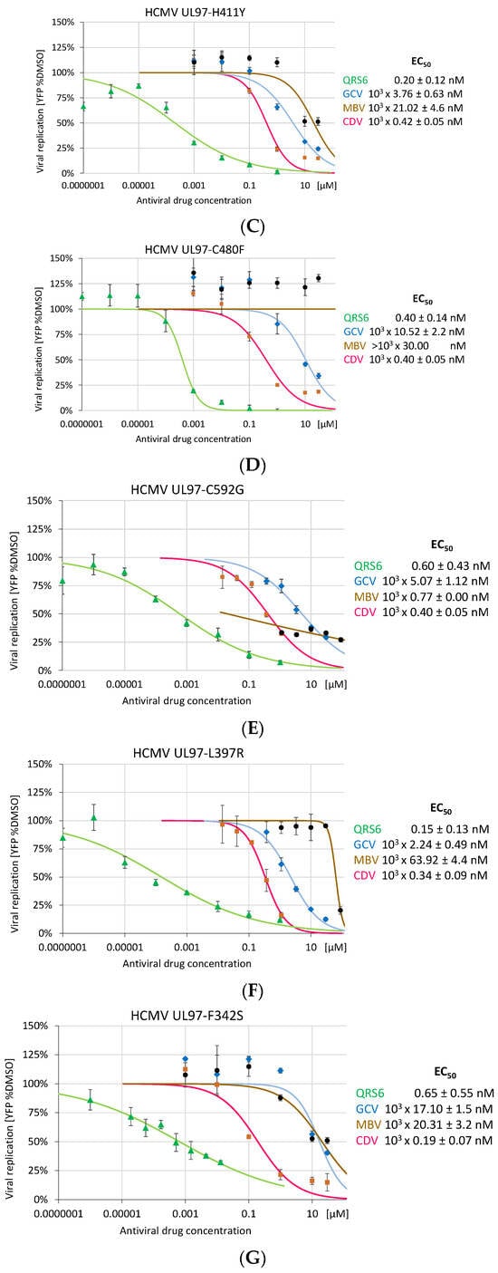 Due to the fact that the HCMV-encoded protein kinase pUL97 represents a functional and structural ortholog of the host CDKs (vCDK/pUL97), the viral mutants of ORF-UL97 were assessed for sensitivity against CDK7 inhibitors. To this end, a series of known GCV- or MBV-resistant HCMV variants, all carrying drug resistance-conferring mutations in ORF-UL97, was used for addressing the question of the occurrence of any viral cross-resistance phenotype concerning QRS compounds. These HCMVs (i.e., UL97 mutants C592G, H520Q (GCV-res.) L397R (MBV-res.) M460I, T409M, H411Y, C480F, F432S, C603W (GCV- and MBV-double res.), and H469V (not determined yet [75])) were used for comparative analysis in HCMV reporter-based antiviral assays. While the resistance phenotypes of these HCMV mutants could in most cases be confirmed in regard to previous reports [62,75], all viruses showed sensitivity to the reference inhibitor cidofovir (CDV), the activity of which is generally unaffected by ORF-UL97 mutations. Concerning compounds QRS6, QRS7, and QRS9, no signs of drug resistance became evident for these GCV- and MBV-resistant HCMVs (Figure 7). Although the EC50 values spanned a range of higher or lower QRS drug sensitivities for these mutants (i.e., low nanomolar to picomolar sensitivities (EC50 ranges from 0.03 nM to 0.73 nM, 0.008 to 7.38 nM, and 0.06 to 4.78 nM for QRS6, QRS7, and QRS9, respectively), no indication of cross-resistance was detectable in any of these cases (Figure 7A–J). This conclusion is ultimately illustrated by the summarized data obtained for the anti-HCMV activity of the reference drugs and QRS compounds exerted against this series of viral resistance mutants (Table 3). Thus, the result clearly underlines the unique antiviral mode of action (MoA) of the CDK7 covalently binding QRS drugs, which is independent from viral vCDK/pUL97 kinase activity or ORF-UL97 resistance mutations.