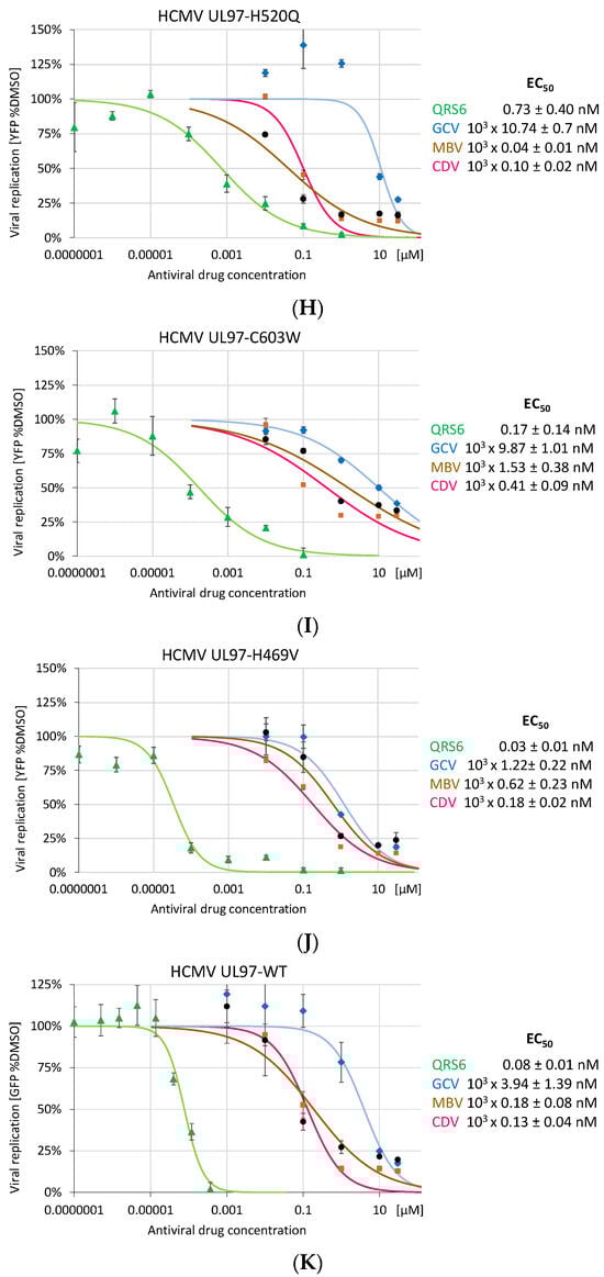 QR6 sensitivity of clinically relevant HCMV mutants carrying UL97 resistance markers against maribavir or ganciclovir. Experimental conditions were identical to those described for Figure 4. HCMV mutants or wild types (WT, AD169-GFP) used were as follows: (A) UL97-M460I (based on AD169-GFP); (B) UL97-T409M (based on TB40-IE2-YFP, like all following mutants); (C) UL97-H411Y; (D) UL97-C480F; (E) UL97-C592G (F) UL97-L397R; (G) UL97-F342S; (H) UL97-H520Q; (I) UL97-C603W; (J) UL97-H469V; and (K) UL97-WT (wild type).