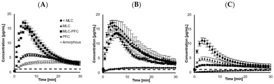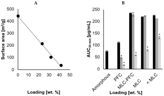 Loading degrees of 23.3, 33.5 and 41.5 wt.% all reached approx. the same Cmax within the same Tmax, although with a tendency to decrease slightly in Cmax and increase in Tmax with increased loading. Despite that, the standard deviation does not allow us to distinguish such differences, and this is somewhat in agreement with classical nucleation theory, stating an early precipitation onset at a higher degree of supersaturation [31]. With increasing drug loading, the dissolution rate decreased, which can be realized from an expected lowering in surface area due to filling up the pores with CCX, also determined from the analysis of BET surface area as a function of CCX loading on SLC (Figure 1A) and also consistent with other studies [25,32]. Regardless of the loading and change in surface area, all three drug loadings (<MLC, MLC, and MLC-PFC) displayed a similar AUC30 min when freshly prepared, indicating that the total release was not impeded.