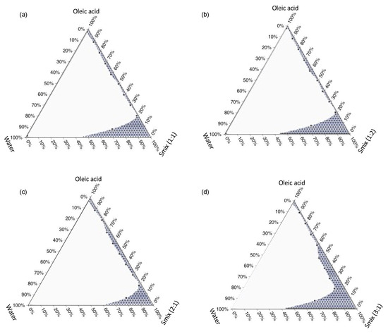 Ternary phase diagrams of oleic acid, water, and various Smix (a) 1:1, (b) 1:2, (c) 2:1, and (d) 3:1. The ME areas are presented by the shaded regions.
