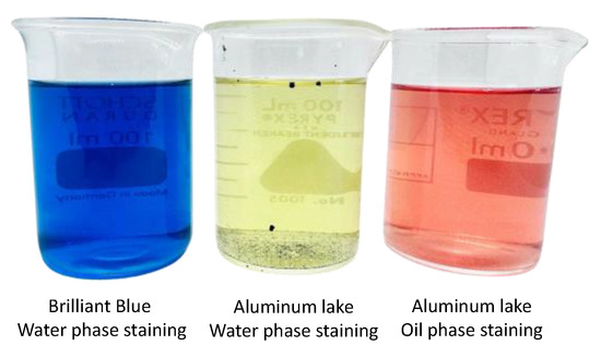 Confirmation of the type of ME formed through dyeing tests with water-soluble dye (brilliant blue) and water-insoluble dye (FD&C RED No. 40 aluminum lake).