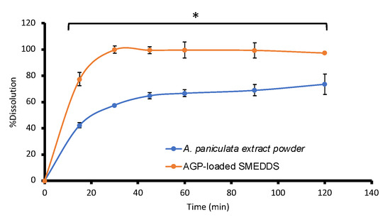 The dissolution profile of AGP from AGPE-loaded SMEDDS compared to A. paniculata extract powder-filled hard capsules (n = 6) in the gastric environment (pH 1.2) (* significant difference, p < 0.05).