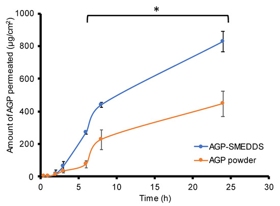 The membrane permeability of AGP was studied using a porcine intestinal membrane. Figure 5 and Table 5 illustrate the comparison of AGP permeation from the SMEDDS and A. paniculata extract powder. It was depicted that the permeation flux, permeability coefficient, and the quantity of AGP permeated at 24 h per area of the AGP from AGPE-loaded SMEDDS was twice as much as those findings from the AGP powder. This was owed to the increased solubility and surface area provided by the homogenous nanosized droplet dispersion of ME. SMEDDS is known to improve oral bioavailability of lipophilic drugs through different mechanisms such as increasing surface area, solubilization, altering membrane function by increasing membrane fluidity, or opening tight junction by surfactants and oils [55,56]. In our case, no report has yet mentioned the polysorbate effect on the alteration of membrane function [57]. Thus, it has been reported that the Tween® 80 effect on increasing drug absorption was mainly due to increased solubilization of the drug and improved contact on the membrane surface, which possibly was herein the main mechanism of improved permeability [58]. Meanwhile, oleic acid has been reported to take part in improving the oral absorption and bioavailability of large molecule drugs as well as hydrophobic drugs, but the exact mechanism has not been concluded [59,60]. The proposed AGPE-loaded SMEDDS showed superior permeability compared with the control AGP for the component, and the developed system took part in improving the permeability of the drug through the intestinal membrane.