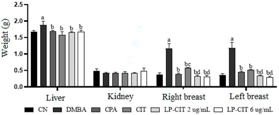During therapy with DMBA, CPA, CIT, and LP-CIT, no significant differences were observed for kidney weight. However, changes in liver weight were observed for DMBA when compared to the vehicle. In addition, there were significant changes regarding weight in the right and left breasts treated with DMBA, in relation to the vehicle group. Treatment with CPA, CIT, and LP-CIT, at both concentrations, reduced the weight of both breasts when compared to DMBA. CIT and LP-CIT showed more efficient results in tumor reduction, being more pronounced for LP-CIT at both concentrations. LP-CIT, in the two evaluated concentrations, presented no significant differences from CPA treatment (Figure 1).