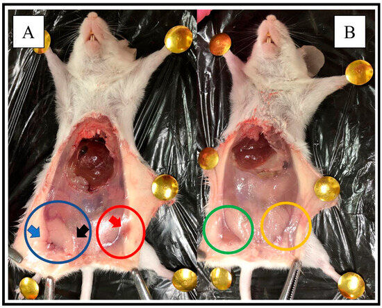 Macroscopic profile of the animals’ breasts, after DMBA-induced tumor. (A): DMBA treatment. Blue circle: right breast. Red circle: left breast. Blue arrow: indication of greater vascularization. Black and red arrow: breast swelling. (B): LP-CIT treatment: observation of breast size reduction after LP-CIT treatment (6 µg/Kg). Green circle: right breast. Yellow circle: left breast.