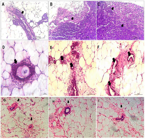 Histopathological profile of the right breast of female mice, after 11 weeks of DMBA treatment (A–C) and 3 weeks of therapy with free citrinin (D–F) and citrinin liposomes (LP-CIT) (G–I). (A): Atypical ductal hyperplasia (black arrow); cell with cytoplasm rich in glycogen (white arrow). (B): Connective tissue mixed with lesion, suggesting invasive carcinoma. (C): basophilia. (D): Usual ductal hyperplasia. (E): Intraductal calcification. (F): Atypical ductal hyperplasia. (G): Duct located in the intralobular stroma formed by adipose tissue. (H): Lobes with regular outline. (I): Significant tumor regression. (H,E): Stain (200× magnification).