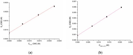 3.4. Determination of the CBZ Partition Coefficients F127 Micelles/Buffer and SBE-β-CD/Buffer