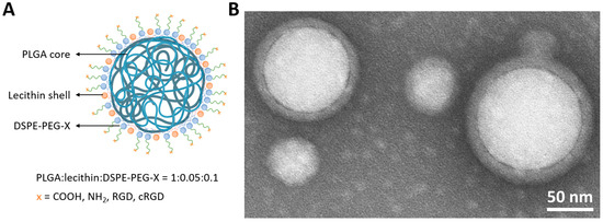 (A) Schematic representation of the structure of a hybrid nanoparticle (HNP) (created with BioRender.com, accessed on 2 October 2023) and (B) cryo-transmission electron microscopy (cryo-TEM) image of HNP-COOH negatively stained with UranyLess EM contrasting solution for 5 min (Science Services).