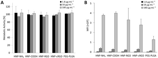 To confirm the DLS results and to visualize the particles, SEM measurements of the HNPs were performed, and the mean size (number-weighted value, dN) of the particles was calculated from the SEM images via image processing (Table 1; Figure S9). The dN values of the HNPs were found to be in the range of 72 nm to 98 nm and confirmed the sizes detected via DLS. The shift to smaller mean diameters in the SEM analysis was expected and was caused by the measurement in the dried state compared to the DLS measurements, which determined the hydrodynamic diameter of the particles in suspension. Overall, the obtained particle sizes were similar for the different functions and were in a valid range for targeted drug delivery applications; it should be mentioned here that the uptake of particles by macrophages generally increases with the particle size [38]. However, in a previous study by C. He, it was reported that the uptake by macrophages can also be increased by increasing the surface charge [39]. An effective uptake with particles in the size range of 150 nm and strongly negative zeta potentials in the range of −30 mV were shown. The HNPs prepared herein also revealed strongly negative zeta potentials (ζ = −29 to −35 mV) for the HNP-COOH, HNP-RGD, and HNP-cRGD as well as moderate values between −14 mV and −20 mV for the HNP-NH2 and the control PEG-PLGA particles (Table 1).