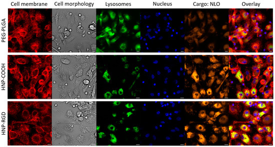 CLSM images of the M0-MDM uptake for PEG-PLGA NPs, HNP-COOH, and HNP-RGD at a concentration of 180 µg mL−1 at 3 h showcasing different organelle staining (red: CellMask™ Deep Red membrane stain (CMDR); green: LysoTracker™ Green DND-26; blue: Hoechst 33342; orange: NLO) (scale bar: 10 µm). The remaining CLSM images are shown in the Supplementary Materials).