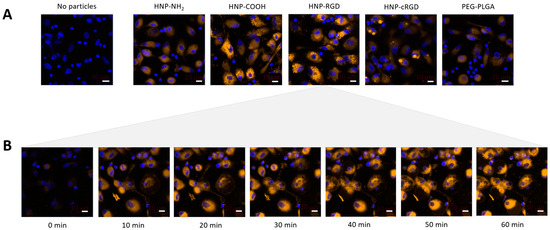 CLSM was employed to track the internalization of HNPs and PEG-PLGA nanoparticles by M0-MDMs after following a 3 h incubation period at a concentration of 180 µg mL−1 (Figure 3 and Figure 4A). To facilitate efficient detection and tracking, the cell nuclei of the macrophages were stained with Hoechst 33342 dye (blue fluorescence), while the NLO was visualized as orange fluorescence. The results revealed that the HNP-COOH and HNP-RDG displayed the highest uptake as indicated by their increased fluorescence intensity. Conversely, CLSM demonstrated that the HNP-NH2, HNP-cRGD, and PEG-PLGA NPs exhibited considerably lower levels of uptake, corroborating the previous findings of the flow cytometry analysis. Additionally, the CLSM images revealed the fluorescence signal of the stained cellular membrane (red) surrounding the intracellular particles and the colocalization of the NLO signal (orange) with the lysosomal signal (green) (Figure 3). As the literature shows, endocytosis is the main process through which nanosized materials are taken up by cells to reach their respective targets [46,47]. Different characteristics of the particles, such as size, shape, and surface charge, can affect the internalization pathways [48,49]. Depending on these factors, the particles are internalized, leading to the formation of endosomes that engulf the particles, which then mature into lysosomes that facilitate the degradation in the material using lysosomal proteases [36]. Thus, as demonstrated by the results, the colocalization of the lysosomes and NLO signaling suggests a potential endocytic uptake pathway of the particles. Furthermore, the kinetics of the HNP uptake were investigated using CLSM, exemplified here by HNP-RGD. As shown in Figure 4B, the uptake of the particles was detectable after as early as 10 min of incubation, signaling a rapid and facilitated uptake by the macrophages.