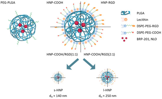 Schematic representation of PEG-PLGA particle and different functionalized HNPs formulated in two size ranges (s-HNPs and l-HNPs). Image created with BioRender.com, accessed on 2 October 2023.