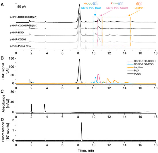 The elution traces of s-PEG-PLGA NPs and s-HNPs with different functional lipids recorded via CAD are shown in Figure 7A. Peak groups between 10 and 15 min clearly distinguished lipids contained in s-HNPs when compared to mere s-PEG-PLGA NPs. Analysis of lipid and polymer standards separately (Figure 7B) allowed us to assign the signals to lipids with different functional groups, i.e., RGD and COOH, that did not show complete baseline separation. Simultaneous detection via DAD and FLD (Figure 7C, D) proved the presence of cargo, i.e., the BRP-201 drug and the NLO dye, in the final HNP-RGD formulation. Individual chromatograms of s-PEG-PLGA NPs and each s-HNP type (including the DAD and FLD traces) can be found in Figures S23–S27. With the batch undergoing HPLC measurements, a brief study of quantification analysis was conducted (Figure S28; Table S9) according to the previously developed protocol [53]. The amount of BRP-201 encapsulated in the s-PEG-PLGA NPs and s-HNPs (recorded via DAD) as well as the amount of PLGA (recorded via CAD) were determined using established calibration curves. The calibration was linear in the range of 5–40 µg mL−1 for BRP-201 (Figure S28A). For the PLGA determination with a CAD, a double logarithmic plot of peak area against concentration was used that showed sufficient linearity in the concentration range of 0.1–5.0 mg mL−1 (Figure S28B). The calculated LC values are presented in Table S9. Although the quantification of the lipid components in the s-HNPs was not performed due to incomplete resolution between the DSPE-PEG-COOH and DSPE-PEG-RGD components (a resolution of only 0.94), an increased peak intensity (peak height) of DSPE-PEG-COOH in s-HNP-COOH/RGD (2:1) compared to s-HNP-COOH/RGD (1:1) indicated a larger amount of the component in the s-HNPs. Five repetitive injections of s-HNP-COOH (Figure S29) showed very low standard deviations of the PLGA and DSPE-PEG-COOH peak retention times, with a coefficient of variation of 0.07% and 0.02% and peak areas with a coefficient of variation of 0.29% and 0.61% (Table S10), respectively. This made the developed method suitable for screening of future HNP formulations regarding qualitative and quantitative composition control.