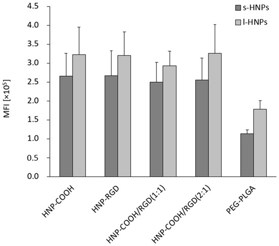 Uptake of the s- and l-HNPs as well as s- and l-PEG-PLGA NPs in M1-MDMs at 100 µg mL−1 (n = 2). MFI = mean fluorescence intensity. No statistical significance was established due to a limited sample size.