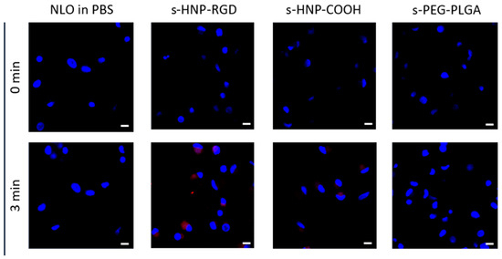 An additional kinetic experiment was conducted to ensure that the observed cellular uptake rate expressed by MFI in the cells was not caused by free dye leakage from the HNPs. As seen in Figure 9 and Figure S13, at 15 min, a clear NLO signal could be detected inside the cells when treated with HNP-COOH and HNP-RGD. This could be distinguished at as early as 3 min; however, no NLO signal was visible when treated with PEG-PLGA nanoparticles and a free NLO dye solution prepared from DMSO and PBS/water. Thus, this confirmed that the dye remained within the particles as long as they were intact and not yet degraded. Moreover, the variation in the signaling among the HNPs also negated a dye leakage because otherwise, a similar pattern and intensity of NLO fluorescence inside the cells would have been detected. This has been demonstrated as well in another study [37].