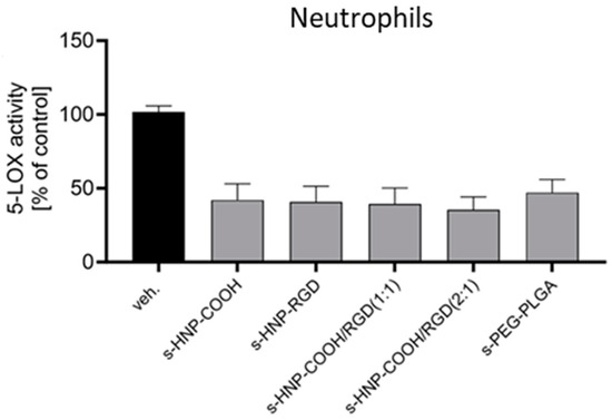 Suppression of 5-LOX product formation by encapsulated BRP-201 in s-HNPs and s-PEG-PLGA NPs or PBS (vehicle (veh.) control) in neutrophils. Neutrophils were preincubated with particles (encapsulated with BRP-201 at a concentration of 0.3 µM) for 15 min at 37 °C and then stimulated with 2.5 µM of A23187. After 10 min, the reaction was stopped, and 5-LOX products were extracted via solid-phase extraction (SPE) and analyzed via HPLC. Values are given as 5-LOX products (LTB4, trans-LTB4, epi-trans-LTB4, and 5-HETE) in percentage (%) of control.