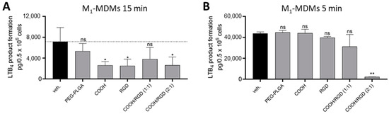 Furthermore, the particles were assessed with pro-inflammatory M1-MDMs that were preincubated with the HNPs for 15 min and then exposed to bacterial exotoxins from Staphylococcus aureus (S. aureus) (Figure 11). The S. aureus-conditioned medium (SACM) was obtained according to Jordan et al. and used at a concentration of 1% for 90 min to induce the biosynthesis of pro-inflammatory LMs, especially LTs in M1-MDMs [59]. In contrast to neutrophils, BRP-201-containing PEG-PLGA NPs only showed a minor inhibition in 5-LOX product formation in M1-MDMs, which could have been due to a reduced uptake rate by the M1-MDMs within the 15 min of incubation time (Figure 8). Also, HNPs formulated with DSPE-PEG-COOH/RGD (1:1) could just slightly reduce LTB4 formation, while HNP-COOH/RGD (2:1) and HNPs with COOH or RGD lipid functionalities impaired the FLAP-dependent LTB4 synthesis significantly (Figure 11A). RGD sequences bind to integrins and are involved in cell signaling [22], which may be an explanation for the inhibition effect these particles showed while PEG-PLGA NPs failed to suppress LTB4 synthesis. Interestingly, after using a shorter preincubation time of only 5 min, HNPs-COOH/RGD (2:1) could significantly inhibit LTB4 formation in M1-MDMs (Figure 11B). This experiment proves that a quick uptake is crucial for an intracellular pharmacological effect.