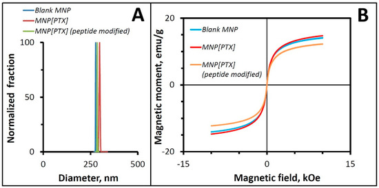Size distribution and magnetic hysteresis curves of MNPs. MNPs with/without drug or surface functionalization exhibited a narrow size distribution with an average hydrodynamic diameter of 260–290 nm (A), strong magnetization at practically achievable field intensities, and a superparamagnetic behavior in the absence of significant remanent magnetization (B).