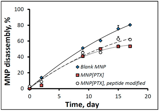 The MNP disassembly in fetal bovine serum proceeded at a near-constant rate, with MNP[PTX], surface-modified and unmodified, showing 62.0 ± 0.5% and 53.4 ± 0.3% disintegration, respectively, at day 17. In comparison, blank MNPs formulated without PTX exhibited notably faster disassembly kinetics (80.4 ± 1.3% disintegration by this time point, Figure 2). The slower decomposition of the drug-loaded MNPs was presumably due to the hydrophobizing effect of the lipophilic PTX incorporated in the MNP matrix and posing a barrier to the access of water into the particle core, thereby decelerating the degradation of the particle-forming hydrolyzable polyester, poly(D,L-lactide).