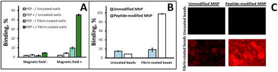 Binding experiments with MNPs modified with fibrin-avid peptide (GPRPP). In (A), binding of MNPs to fibrin-coated wells was examined in fetal bovine serum (diluted 1:120 v/v) as a function of surface functionalization with GPRPP peptide and exposure to a high-gradient magnetic field (average field gradient = 32.5 T/m) using a magnetic separator for 96-well plates. In separate experiments (B), depletion of peptide-functionalized MNPs was compared to that of unmodified control MNPs incubated with fibrin-coated glass beads (0.25 mm). Uncoated beads were included as a control. The beads were examined for MNP binding by fluorescent microscopy (original magnification ×40, (C)). Results are shown as mean ± standard deviation.