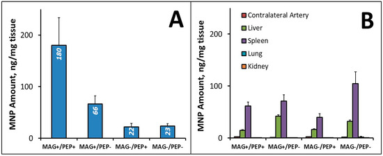 Comparative analysis of MNP levels in stented arteries (A) and in non-target tissues (B) 7 days after MNP delivery with/without magnetic exposure (MAG+ and MAG−, respectively) or with/without functionalization with the affinity ligand (PEP+ and PEP−, respectively). Note the markedly improved target:non-target ratio in the experimental (MAG+/PEP+) vs. control animal groups. Data are shown as mean ± standard error (n ≥ 5).
