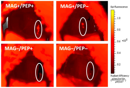 The results of live animal fluorescent imaging performed 3 days after the procedure (Figure 5) agreed with the fluorimetric analysis findings. Stent-localized MNPs were uniformly observed along the stented segment in the dual targeting group (MAG+/PEP+). A notably lower signal associated with the stented arterial segment was detected in the MAG+/PEP− group, whereas in the two groups treated without magnetic exposure (MAG−/PEP+, MAG−/PEP−), no signal was detectable in the stented artery (See Table 1). Consistent with the results of the biodistribution analysis, magnetic guidance was found to dominate the uptake and retention of MNPs in the stented arterial segment (p = 0.003 for the effect of magnetic delivery compared to 0.036 for peptide modification).