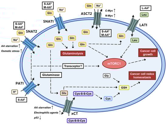 Overview of the roles and interconnection of select amino acid transporters in cancer growth. Potential determinants of cancer growth are highlighted in red. Factors that regulate the expression of the transporters are presented in Italics next to the transporter and indicate whether the expression is up- or downregulated. The figure draws inspiration from [25]. S-AA0: small neutral amino acids, M-AA0: medium neutral amino acids, L-AA0: large neutral amino acids, mTORC1: mammalian target of rapamycin complex 1, Cys-S-S-Cys: cystine, GSH: glutathione.