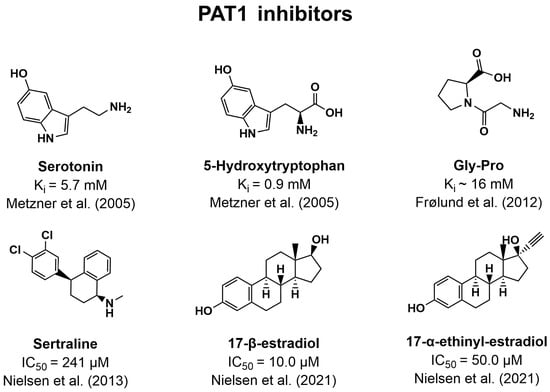 As for all solute carriers, one substrate may competitively inhibit the transport of another substrate, but some true inhibitors for PAT1 have also been identified. The first inhibitors were identified by the group of Matthias Brandsch, who surprisingly showed that amines and amino acids such as serotonin (Ki = 5.7 mM), L-Trp (Ki = 4.7 mM), and 5-hydroxy-tryptophan (Ki = 0.9 mM) were inhibitors of PAT1 (Figure 6) [264]. Later, Frølund et al. showed that dipeptides bearing -H as a side-chain such as Gly-Gly and Gly-Sar, similar to δ-aminolevulinic acid, were substrates of PAT1, while dipeptides such as Gly-Tyr (Ki~20 mM), Gly-Pro (Ki~16 mM, Figure 6), and Gly-Phe were inhibitors [265]. While the amino acid inhibitors had a similar affinity to the normal substrates, the dipeptides had a much lower affinity. Later, high-affinity inhibitors such as the anti-depressant sertraline (IC50 of 177–241 µM, Figure 6) [266] and 17-α-estradiol and 17-β-estradiol (E2, Figure 6) were identified [267]. Shan et al. suggested that estradiol binds to PAT1 and thereby changes the conformation of the PAT1 protein from an open to a closed state, thereby decreasing transport activity [267]. Recently, Nielsen et al. revisited this to assess the potential for drug-drug interactions, showing that 17-α-ethinyl-estradiol (E-E2, Figure 6) inhibited PAT1-mediated Pro and taurine transport in vitro in Caco-2 cells [268]. Under slightly acidic extracellular conditions, E2 and E-E2 inhibited Pro uptake with IC50-values of 10.0 ± 3.2 µM and 50.0 ± 14.3 µM, respectively [268]. The uptake of taurine was inhibited by E and E-E2 with IC50-values of 8.7 ± 5.1 µM and 22.9 ± 15.5 µM, respectively [268]. In contrast, the uptake of taurine via TAUT at neutral extracellular pH was not affected by E2 or E-E2 in the concentration range investigated [268]. The Pro-induced signal was attenuated when E2 and E-E2 were present in the Pro-containing solution being perfused over the oocyte. Buffers with E2 and E-E2 alone did not induce an inward current, showing that they were non-translocated inhibitors of PAT1 [268]. The physiological role of amino acids, dipeptides, and hormones acting as inhibitors of PAT1-mediated transport remains unknown.