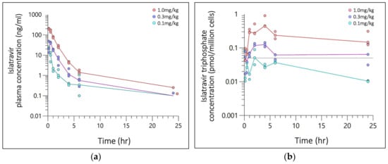 ISL was quantified in plasma and ISL-tp in PBMC cell lysate using previously published liquid-chromatography tandem mass spectrometry (LC-MS/MS) methods [22,24]. In short, ISL and ISL-tp were prepared in 100 μL of 70:30 methanol/water and extracted with isotopically labeled internal standards (IS-3C15N3-ISL and 3C10,15N5-dGTP, respectively) and detected on an AB Sciex API-5000 triple quadrupole mass spectrometer under positive ionization mode (SCIEX, Framingham, MA, USA). A dynamic calibration range of 0.1–100 ng/mL was used for ISL with precision and accuracy acceptance criteria within ±15%. ISL-tp was analyzed using the same mass spectrometer calibrated for 0.05–125 ng/mL (ISL-tp). ISL-tp concentrations were normalized to representative live cell counts determined by Trypan blue staining and a hemocytometer and reported as pmol/million cells. Concentrations below the limit of quantification (LLOQ) for each were censored according to the Beal M2 method [25].