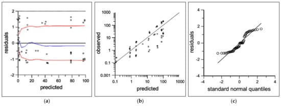 Two-compartment population PK diagnostics showing observed (open circles) and predicted (black lines) for (a) individual predicted concentrations vs. residuals with loess fit (blue) and absolute trend lines (red), (b) individual predicted vs. observed log-concentrations, and (c) quantile–quantile normal plot.