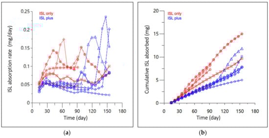 The mean absorption rate from 0 to 154 days in the ISL-only and -plus groups were 0.084 ± 0.025 and 0.061 ± 0.018 mg/day with an overall mean of 0.072 ± 0.024 mg/day (Figure 4a). The mean cumulative mass absorbed from 0–154 days for the ISL-only and ISL-plus groups was 8.82 ± 4.07 and 8.53 ± 2.60 mg, respectively with an overall mean of 8.67 ± 3.22 mg (Figure 4b).