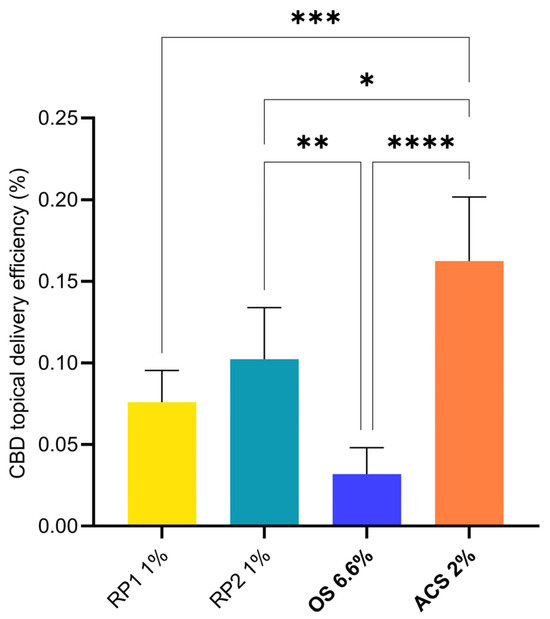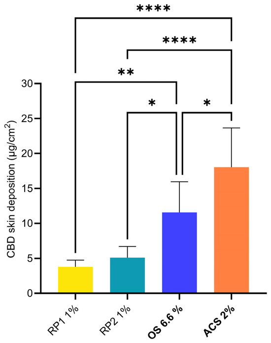 The remaining formulations yielded skin depositions between 3.78 ± 0.97 µg/cm2 (RP1 1%) and 18.03 ± 5.64 µg/cm2 (ACS 2%). The statistical comparison of the different groups is presented in Figure 1. Only the depositions from the two comparator formulations were non-significantly different. Both OS 6.6% and ACS 2% formulations outperformed the reference formulations, RP1 1% and RP2 1%, in terms of cutaneous delivery. The ACS 2% formulation delivered more CBD to the skin than OS 6.6% despite a three-fold-lower CBD content, thus increasing the delivery efficiency.