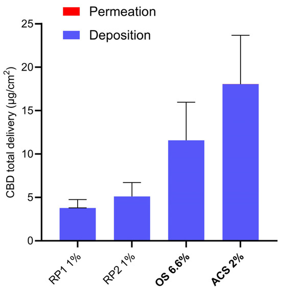 Total CBD delivery was dominated by cutaneous deposition, given that it was approximately 1000-fold higher than the transdermal permeation (Figure 2).