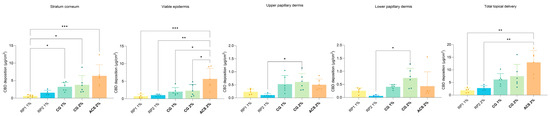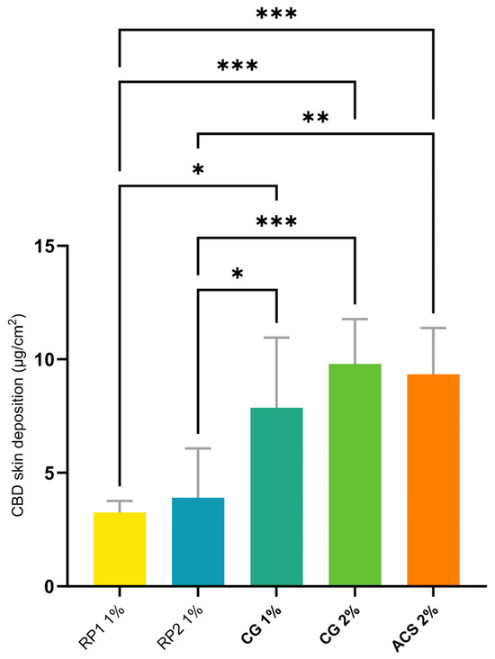 Statistical comparison of skin deposition of CBD from different formulations (defined in Table 4) under finite-dose conditions. p-values were calculated using the ANOVA one-way test; statistically significant differences are denoted by asterisks (* p ≤ 0.05; ** p ≤ 0.01; *** p ≤ 0.001).