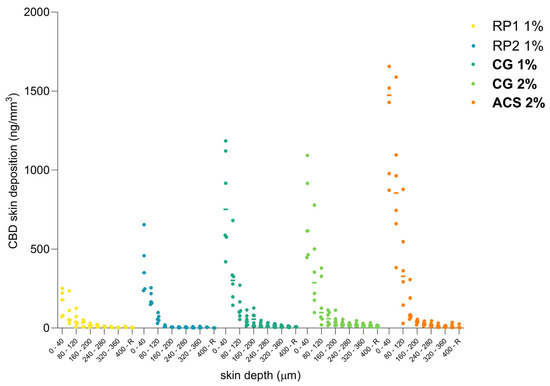 The skin deposition of CBD from the ACS 2%, CG 1%, and CG 2% formulations outperformed RP1 and RP2. There was no statistically significant difference in CBD deposition outcomes between CG 1% and CG 2% (7.87 ± 3.09 and 9.80 ± 1.98 µg/cm2, respectively), despite the difference in CBD content. There was therefore no benefit to doubling the concentration of CBD in the formulation from 1% up to 2% from an end-product-manufacturing point of view. It is possible that a larger increase in drug content can nevertheless elicit an increase in the cutaneous deposition if required to improve the therapeutic efficacy. Furthermore, and importantly, there was no difference in the deposition values between CG 1%, CG 2%, and ACS 2%. This indicated that the thermodynamic activity of CBD and its partitioning into the skin were not impaired by gelation and that the CBD was still released successfully.