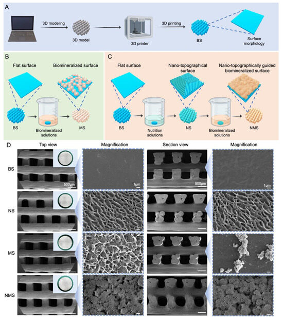 (A) The fabrication of 3D-printed PCL scaffolds. (B) The procedure for conventional biomineralization. (C) The procedure for nano-topographically guided biomineralization. (D) General view and SEM results of BS, NS, MS, and NMS, respectively.