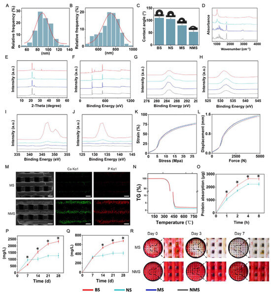 The surface characteristics of the biomineralized coating of MS and NMS were further investigated to compare the approaches of nano-topographically guided biomineralization and conventional biomineralization. Calcium (Ca) and phosphorus (P) were the two main components of the biomineralized coating. The Ca and P ion distribution on the surface of MS and NMS was investigated by elemental energy dispersive spectrum (EDS). The Ca ions are marked green, while the P ions are marked red. The thermal stability of MS and NMS was measured by thermogravimetric analysis (TGA). In addition, the TG–temperature curves of MS and NMS were calculated. The release of Ca and P ions is an important aspect in investigating the characteristics of biomineralized coating. The bioactive ions released from MS and NMS at different time points were evaluated by inductively coupled plasma atomic emission spectroscopy (ICP-AES; Vista AX, Thermal Scientific Co., Ltd., Waltham, MA, USA). The protein adsorption capacity of MS and NMS was investigated by the protein estimation kit (Beyotime, BCA Protein Assay Kit, Shanghai, China). In order to investigate the adhesion of the biomineralized coating of scaffolds, the scaffolds were immersed in PBS and placed on the horizontal shaker. Then, the scaffolds were immersed in an alizarin red solution for 30 min.