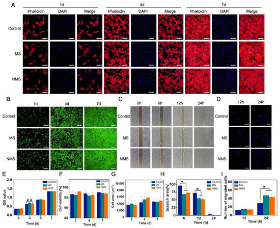 The cell migration and invasion of USCs co-cultured with MS and NMS were investigated by the scratch–wound assay and transwell invasion assay. The USCs were seeded onto a microwell plate. When the USCs covered the bottom of the plate, the cell layer was scraped in a straight line using a 1 mm pipette tip. Then, the microscope was used to image the same pot at 0 h, 6 h, 12 h, and 24 h. Different from the above co-culture approach, the USCs were seeded on the top chamber of the transwell plates and the scaffolds were placed on the lower chamber during the transwell invasion assay. After incubation for 24 h, USCs that migrated to the lower surface of the top chamber membrane were fixed with 4% formaldehyde and stained with DAPI. The number of migrated USCs was calculated. In addition, in order to observe cellular behaviors on the surface of MS and NMS, the USCs were also directly seeded onto the surface of MS and NMS. Live/dead staining and phalloidin/DAPI staining were used to investigate the proliferation and cytoskeleton changes of USCs when directly co-cultured on the surface of scaffolds. In addition, the cell viability and cell area of USCs on the biomineralized coating were also calculated.