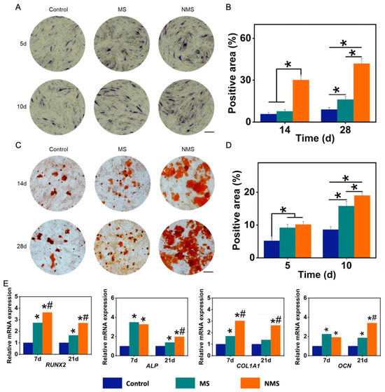 Ideal biomineralized coating on the surface of scaffolds can mimic the microenvironment of natural bone tissue, provide appropriate biochemical and physical signals, guide the osteogenic differentiation of stem cells, and enhance the deposition and mineralization of bone matrix after implantation [50]. Alkaline phosphatase (ALP) is highly expressed in the cells of mineralized tissue and plays an important role in hard tissue formation. In addition, ALP has been considered to be an initial marker during the process of osteogenic differentiation. Figure 4A shows the ALP staining results of USCs co-cultured with scaffolds. The positive area of ALP staining is calculated in Figure 4B. The ALP-positive areas of MS and NMS were significantly higher than that of the control group on day 5 and day 10. In addition, the ALP-positive area of NMS was significantly higher than that of MS on day 10. Alizarin red staining (ARS) was used to evaluate calcium-rich deposits by cells in the culture. As shown in Figure 4C, the ARS results show that more calcium nodules were found in the NMS group than in other groups. The positive area of the ARS results is also calculated in Figure 4D. The ARS-positive area of the NMS group was higher than that of the groups MS and control on day 14 and day 28. In addition, the ARS-positive area of the MS group was higher than that of the control group. Figure 4E shows the osteogenic-related gene expression of USCs co-cultured with scaffolds. As a member of the RUNX family of transcription factors, RUNX2 regulates the process of osteogenic differentiation. The RUNX2 expression of the NMS group was significantly higher than that of the groups MS and control on day 7 and day 21. ALP is produced mainly by bones and the liver. In addition, ALP can take part in hydrolyzing inorganic pyrophosphate and provide inorganic phosphate to modulate the process of biomineralization in bone tissues. The ALP expression of groups NMS and MS was significantly higher than that of the control group. As an early maker of osteogenesis, COL1A1 plays a crucial role in the formation of collagen fiber and the strengthening of bone tissue. The COL1A1 expression of the NMS group was significantly higher than that of the groups MS and control on day 7 and day 21. As a late maker of osteogenesis, osteocalcin is produced by osteoblasts or stem cells. In addition, OCN is a non-collagen protein and plays a vital role in regulating the processes of mineral deposition and bone remodeling. The OCN expression of groups of NMS and MS was significantly higher than that of the control group on day 7 and day 21. Additionally, the OCN expression of the NMS group was significantly higher than that of MS on day 21. Compared with biomineralized coating fabricated by the conventional method, the biomineralized coating fabricated by nano-topographical guidance showed a better regulation capacity in guiding the osteogenic differentiation of USCs.