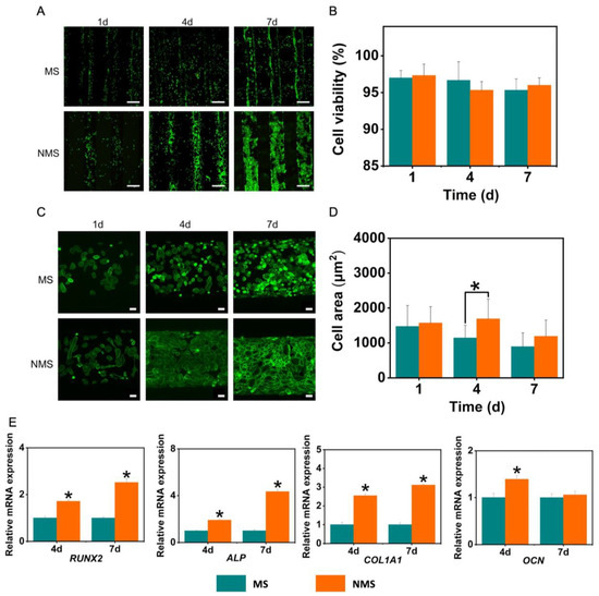 In our study, USCs were also seeded onto the scaffolds to evaluate the direct effect of two mineralized scaffolds on cellular behaviors. The proliferation and cellular morphology changes of stem cells on the surface of scaffolds play a very important role in osteogenesis in vitro and in vivo. As shown in Figure 5A, the USCs on the surface of MS and NMS exhibited a stable proliferation ability. With the expansion of the culture time, the number of USCs on the scaffolds gradually increased. Compared with the MS group, more USCs could be observed on the surface of NMS. On day 7, USCs on the surface of NMS could fuse together and cover the scaffold fiber. However, as shown in Figure 5B, no significant differences were found in terms of cell viability between the groups MS and NMS. Figure 5C shows the results of the phalloidin staining of USCs seeded onto scaffolds on day 7. The USCs on the surface of MS were scattered while the USCs on the surface of NMS merged. In addition, as shown in Figure 5D, the cell area of the NMS group was significantly higher than that of the MS group on day 4. Figure 5D shows the osteogenesis-related gene expression of USCs on the surface of MS and NMS. The COL1A1, ALP, and RUNX2 expression of the NMS group was significantly higher than that of the MS group, which confirmed the direct contribution to osteogenesis in vitro.