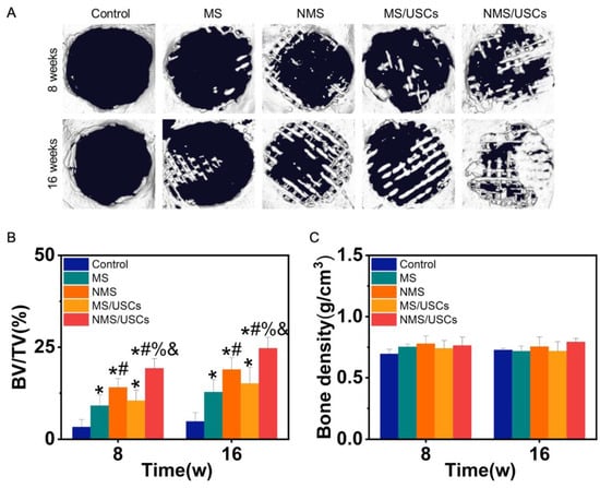 (A) Micro-CT results of scaffolds implanted into bone defects. (B) The BV/TV of each group after implantation. (C) The bone density of newborn bone formation in bone defects. * p < 0.05, compared with control, # p < 0.05, compared with MS, % p < 0.05, compared with NMS, & p < 0.05, compared with MS/USCs.