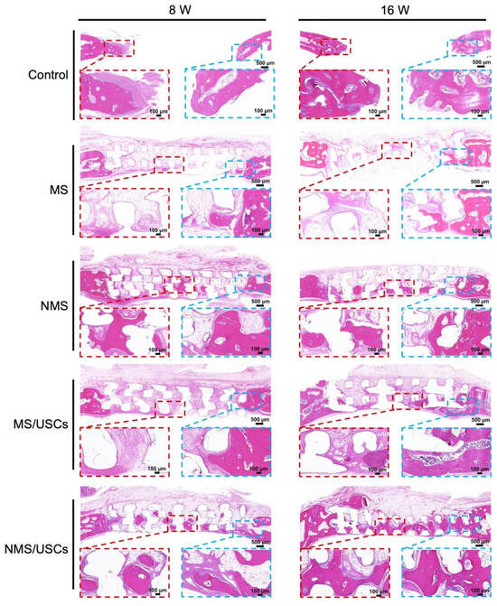 After implantation, the biomineralized coating on the surface of polymer scaffolds is able to provide the proper microenvironment for bone regeneration by continuously releasing Ca and P ions [51]. The crystals of calcium and phosphorus compounds in the biomineralized coating can serve as a template for bone matrix formations. In addition, various proteins can adhere to the surface of scaffolds and mediate and regulate the process of bone formation. The HE staining results of the central area of the bone defects at 8 and 16 weeks after implantation are shown in Figure 7. At 8 weeks after implantation, no obvious newborn bone formation was found on the bone defects of the control group. In the MS group, only a small amount of newborn bone formation was found at the edge of the bone defects. In addition, some of the fibrous tissue was distributed around the scaffold fiber. Compared with the MS group, more newborn bone formation was distributed inside the NMS scaffolds. Furthermore, newborn bone formation mainly occurred around scaffold fibers. In the MS/USCs group, many fibrous tissues were found inside the scaffolds and no obvious newborn formation occurred in bone defects. In the NMS/USCs group, newborn bone formation occurred inside the scaffolds. Compared with the NMS group, more newborn bone formation was distributed in the central area of bone defects. At 16 weeks after implantation, only a small amount of newborn bone formation occurred at the edge of bone defects. Compared with the MS groups, more newborn bone formation occurred along the scaffold fiber in NMS. In the MS/USCs group, few newborn bone formations were found inside the scaffolds. Compared with the other groups, a large amount of newborn bone formation was found in the NMS/USCs group. In addition, the newborn bone formed along the scaffold fibers and almost filled the inside of the scaffolds.