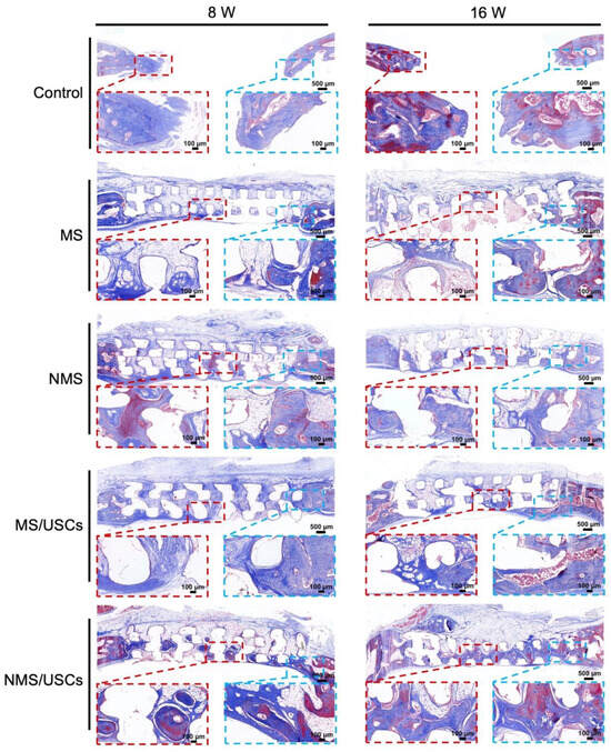 The Masson staining results of the central area of bone defects at 8 and 16 weeks after implantation are shown in Figure 8. The blue area represents the mineralized bone of newborn bone formation and the red area represents the osteoid, unmineralized bone tissue [52]. The Masson staining results of all groups were consistent with the HE staining results. According to the Masson staining results, the newborn bone tissue of all groups was calculated to quantitatively investigate the bone regeneration in the central areas of bone defects (Figure 9). The new bone area of each scaffold group was significantly higher than that of the control group at 8 and 16 weeks after implantation. The new bone area of the NMS group was significantly higher than that of the MS group at 8 and 16 weeks after implantation. Interestingly, the new bone area of the NMS group was significantly higher than that of the MS/USCs group at 16 weeks after implantation, which demonstrated that effective biomineralized coating is better than stem cells combined with weak biomineralized coating for the long-term regulation of osteogenesis in vivo. In addition, the new bone area of the NMS/USCs group was significantly higher than that of the other groups at 8 and 16 weeks after implantation, which demonstrated that nano-topographically guided biomineralized coating combined with USCs can exert a good synergistic effect on the induction of osteogenesis in vivo.